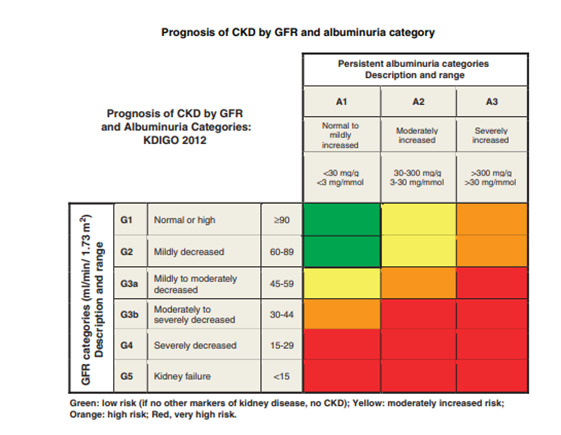 While creatinine clearance can be calculated, patients should be classified into CKD stage by both eGFR as estimated by either the MDRD or CKD-EPI formulae as well as the amount of urinary protein excretion. Patients with decreased eGFR, increased urinary albumin excretion or both, are at high risk of progressive CKD and should be referred to nephrology for further management.